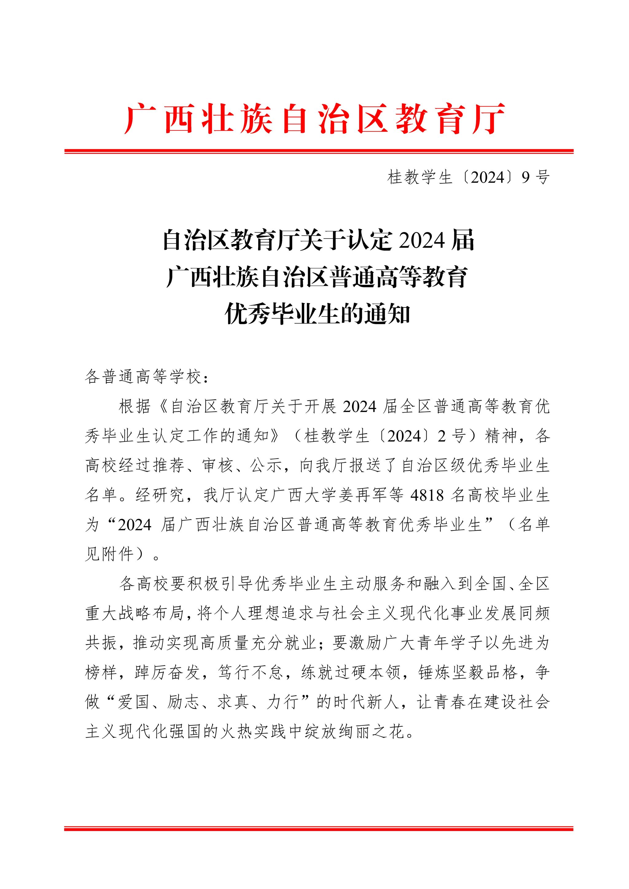 日前,自治区教育厅发布《自治区教育厅关于认定2024届广西壮族自治区普通高等教育优秀毕业生的通知》(桂教学生〔2024〕9号),认定全区4818名高校毕业生为“2024届广西壮族自治区普通高等教育优秀毕业生”。乐天堂f88黄粲茗等121名毕业生被认定为“2024届广西壮族自治区普通高等教育优秀毕业生”。