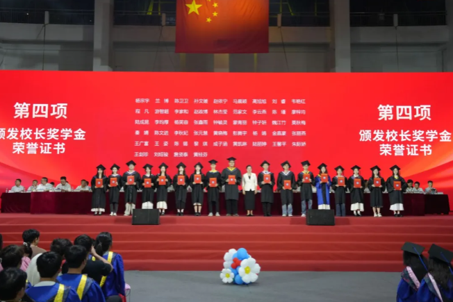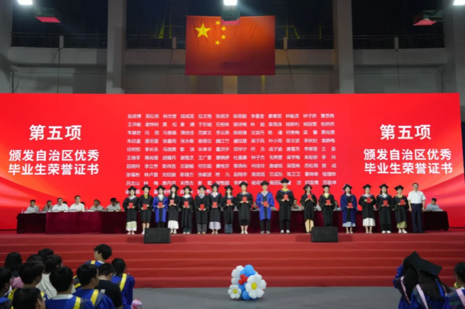 卞成林、韦仕珍分别为获得自治区优秀毕业生称号与校长奖学金的毕业生颁发荣誉证书。校党委副书记陈铭彬宣读入选大学生志愿服务“西部计划”志愿者、选调生等毕业生名单以及应征入伍名单。