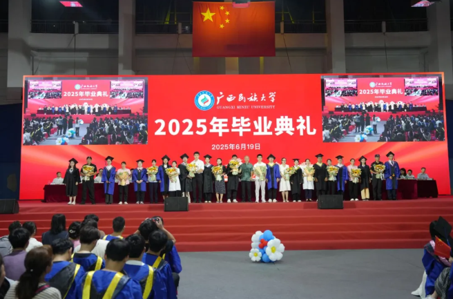 向阳而生,鹏抟万里。6月19日晚,乐天堂f882025年毕业典礼暨学位授予仪式在相思湖校区举行。学校党委书记卞成林,校长韦仕珍,校领导陈铭彬、韦雪芳、邓国彬、蔡高根、黄晓娟、吕俊彪、何立荣、姜明国,各学院、有关部门负责人,教职工代表,毕业生导师、辅导员、2025届毕业生及亲友齐聚一堂,共同见证这一重要时刻。毕业典礼由校党委副书记邓国彬主持。