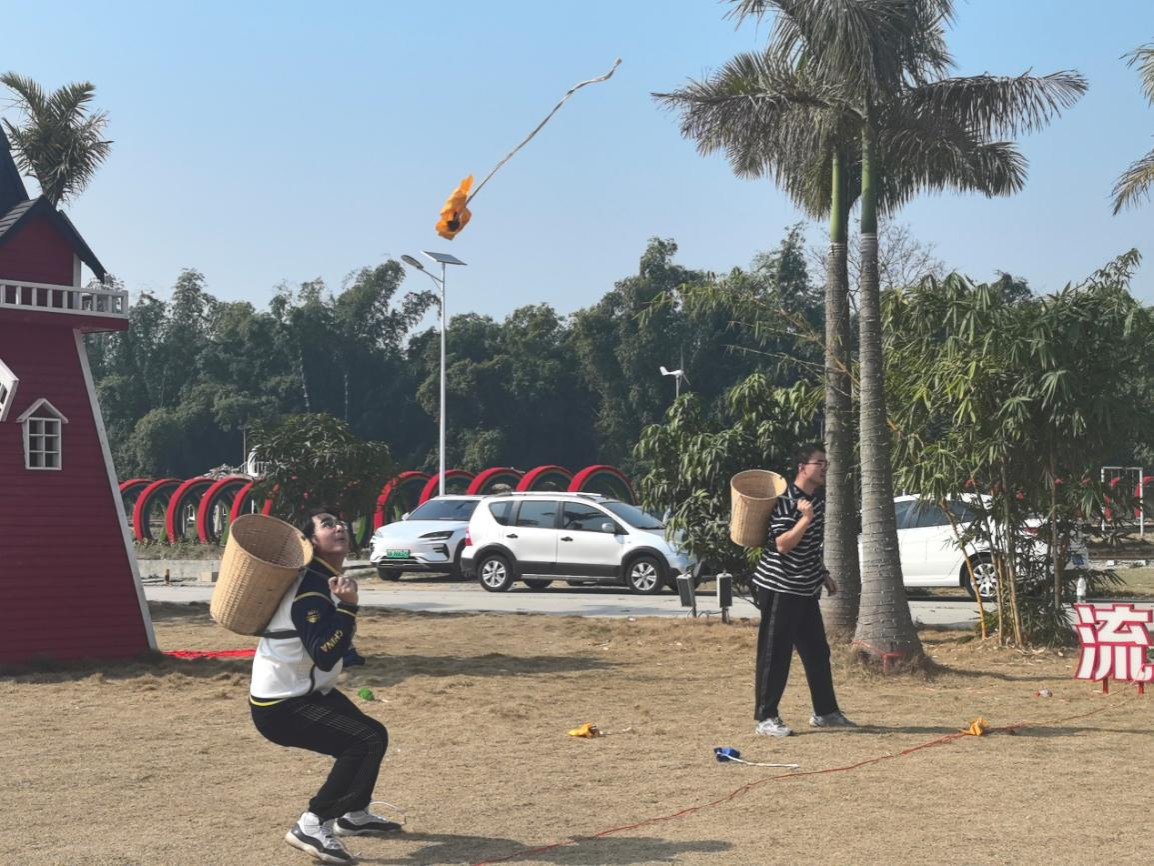 背篓投绣球项目源自广西壮族的传统体育活动,具有浓郁的民族特色。投球手站在投掷线后,眼神坚定,手臂轻扬将绣球抛出,手中绣球如离弦之箭,精准飞向背篓手身后的背篓。背篓手则在规定接球圈内灵活移动,身姿矫健,紧盯绣球,看准实际调整肩带,全力接住每一个飞来的绣球。